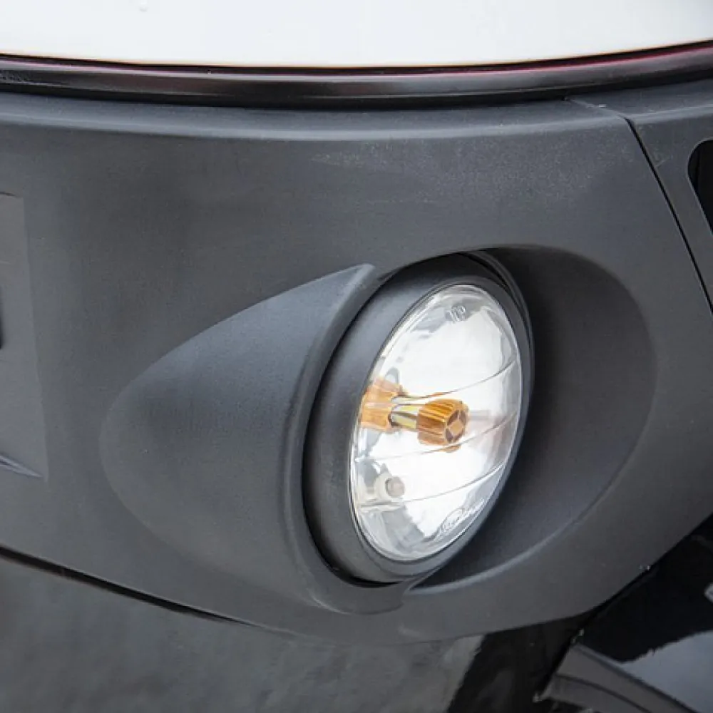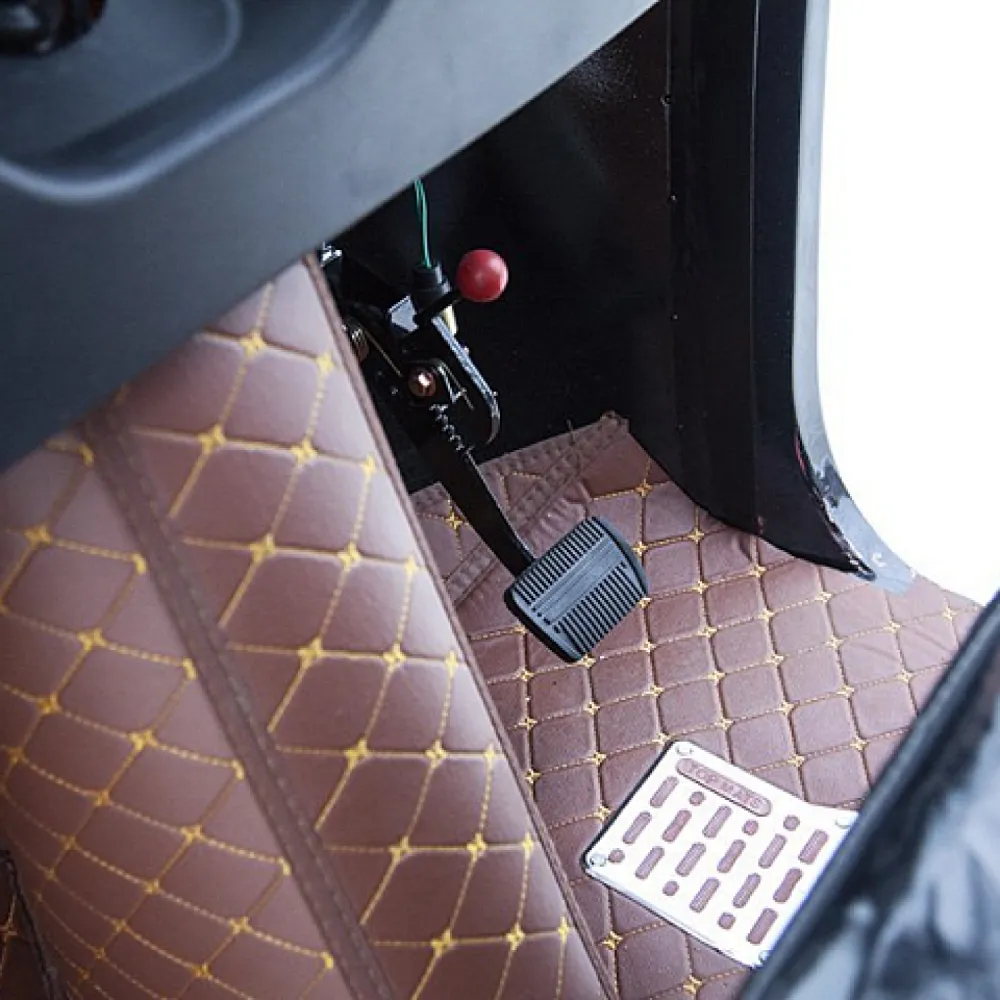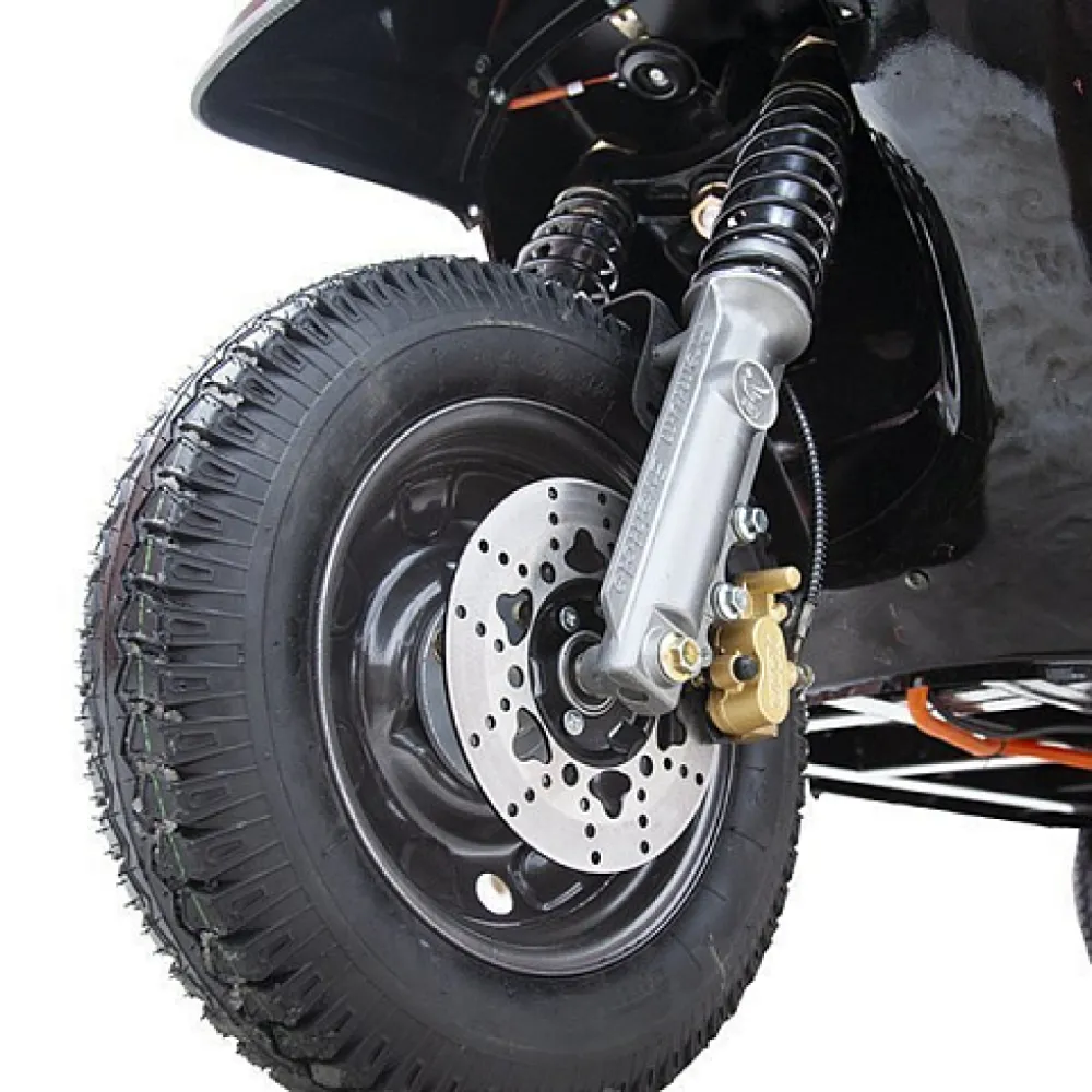 Удобство и комфорт езды обеспечены 2 мягкими анатомическими сиденьями. Наличие крыши позволяет спрятаться от негативного воздействия ультрафиолета и осадков. 12 дюймовые нактистые колеса способны преодолевать подъемы до 15 градусов, обеспечивать плавность езды по неровностям. Скорости контролируются с помощью ручки газа. Важные технические параметры с помощью бортового компьютера, размещенного на видимой части панели.